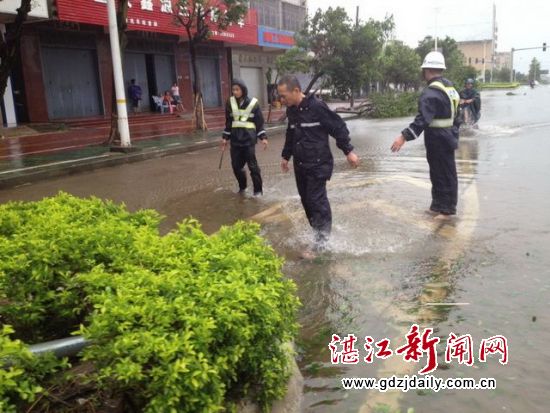 民警沿途清除排水口的垃圾,疏通路面积水保畅通。