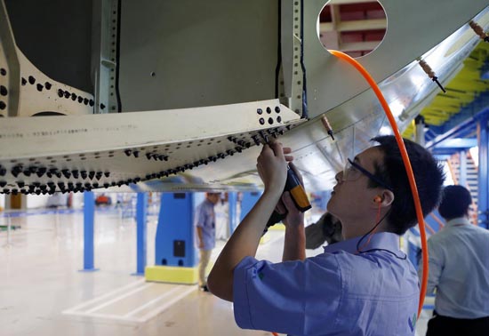 那C919优势何在?中国商飞上海飞机设计研究院总体气动设计研究部部长黄炜将C919的优势定义为“安全、舒适、经济和环保”,减阻5%、减排50%、减重2%,发动机比现在正在运营的同等座级的机型降低燃油消耗12%-15%。《航空知识》杂志副主编王亚楠认为,C919从研制之初就紧跟现代民航业界的主流技术,发动机用的和波音、空客是一样的。C919和A320,以及改进型A320neo、波音737MAX是在一个水平上的。图为工程技术人员在C919大型客机的前机身与中机身处进行对接作业。
