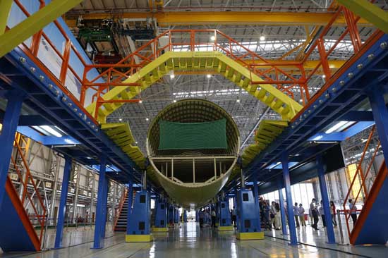 截至2014年8月,C919已获得400架订单,但其获得的订单主要是国内航空公司和金融租赁机构。欧洲最大的低成本航空公司Ryanair曾与中国商飞签订合作协议,有购买C919的意向,但至今没有确切订单。未来订单是否会有保障?王亚楠说,这一点不需要太多担心。中国民航市场容量非常大,在境外订单很少的情况下也有很大需求量,中国还是有很多干线和支线航空装备缺口的,C919可以充盈国内市场。图为C919大型客机首架机结构总装生产线上的前段机身。