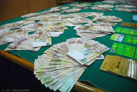 2014年9月23日,中国澳门,两男女涉嫌洗黑钱被澳门治安警拘捕。据了解,涉案两男女21日晚10时许在新口岸宋玉生广场一银行被澳门治安警拘捕。图为案件中起获的大量现金。