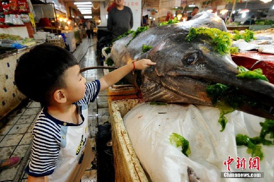 9月24日,一条3.06米长、412斤重的巨型“箭鱼王”被摆放到了青岛市伊春路益欣超市的野生鱼摊档上,引起市民的好奇和围观。中新社发 王海滨 摄 图片来源:CNSPHOTO