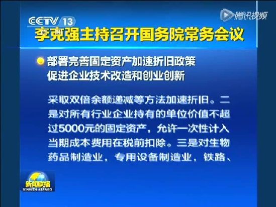 会议指出,顺应新技术革命潮流,推动中国经济向中高端水平迈进,必须更大力度推进企业技术改造。要用既利当前、更惠长远的改革办法,完善现行固定资产加速折旧政策,通过减轻税负,加快企业设备更新、科技研发创新,扩大制造业投资,促进大众创业,这对于传统产业“破茧化蝶”,增强经济发展后劲和活力,实现提质增效升级和持续稳定增长,具有重要意义。会议确定,一是对所有行业企业2014年1月1日后新购进用于研发的仪器、设备,单位价值不超过100万元的,允许一次性计入当期成本费用在税前扣除;超过100万元的,可按60%比例缩短折旧年限,或采取双倍余额递减等方法加速折旧。二是对所有行业企业持有的单位价值不超过5000元的固定资产,允许一次性计入当期成本费用在税前扣除。三是对生物药品制造业,专用设备制造业,铁路、船舶、航空航天和其他运输设备制造业,计算机、通信和其他电子设备制造业,仪器仪表制造业,信息传输、软件和信息技术服务业等行业企业2014年1月1日后新购进的固定资产,允许按规定年限的60%缩短折旧年限,或采取双倍余额递减等加速折旧方法,促进扩大高技术产品进口。根据实施情况,适时扩大政策适用的行业范围。会议要求加快落实上述政策,努力用先进技术和装备武装“中国制造”,推出附加值更高、市场竞争力更强的产品。