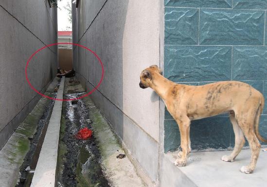 9月25日,山东省某村村民发现村里的范某死在自家西侧的胡同里,有人报警。民警现场了解,范某是个上门女婿,平时一日三餐必有白酒,喝完就骂街,还多次扬言要从自家楼顶自杀。而死者的岳父一家均称范某是25日凌晨醉酒后坠楼摔死的。图为小狗孤单地守望着主人去世的地方。死者范某养的狗用于追野兔当下酒菜。