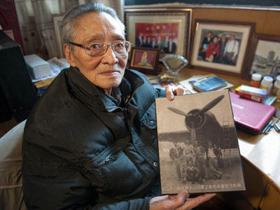 3月16日,龙启明展示当年他和“飞虎队”战友在云南昆明巫家坝机场的合影。