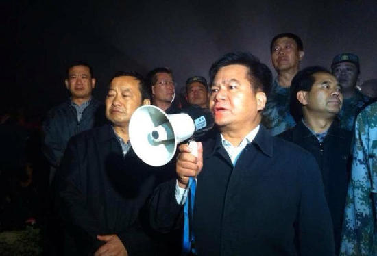 云南省省长李纪恒到达震中芒费村七七组,探访灾情,并现场听取地震局同志讲解具体情况。