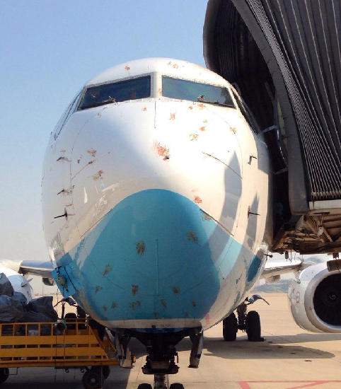 网曝厦航一飞机撞鸟 机身血迹斑斑