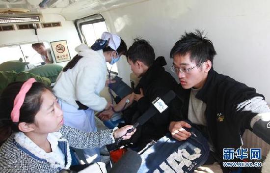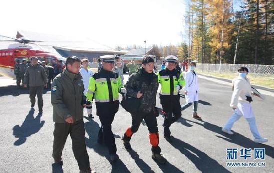 10月7日,获救大学生(前左三)抵达长白山北景区直升机停机坪。