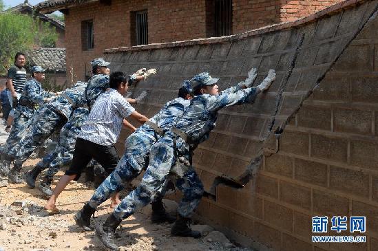 10月8日,在景谷县永平镇迁毛村,成都军区空军官兵和当地群众合力推倒危墙。云南省普洱市景谷傣族彝族自治县北京时间10月7日21时49分发生6.6级地震。截至8日15时,地震已造成1人死亡、324人受伤、6988间房屋倒塌、5个县(区)12.46万人受灾。新华社记者胡超 摄