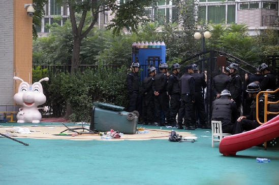 通州区新华联锦园汇佳幼儿园租赁合同到期,随后浩鸿文化发展有限公司成立新的幼儿园。汇佳原有的300多名学生需面临中途更换学校。10月4日中午,浩鸿的工作人员及安保人员强行进入学校,并将校门门锁撬开,强行驱离汇佳值班工作人员,对园内部分物品进行拆卸。图为幼儿园内部被打砸。