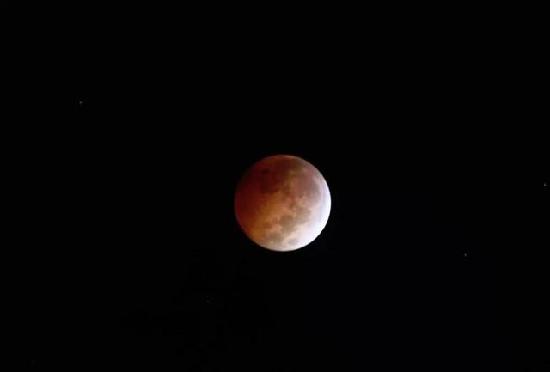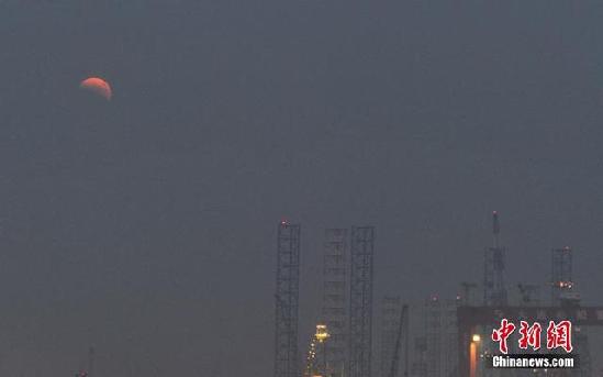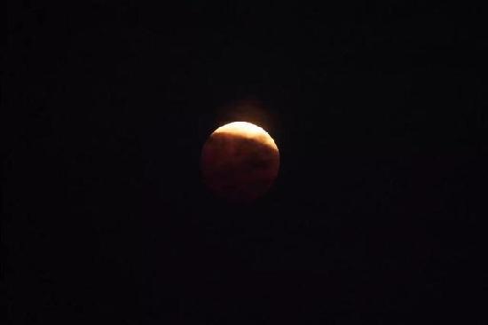 10月8日晚,四年来最美的月全食亮相天空。图为山东烟台网友拍摄到的“红月亮”。受雾霾影响,今晚我国部分地区很难观看到“红月亮”。