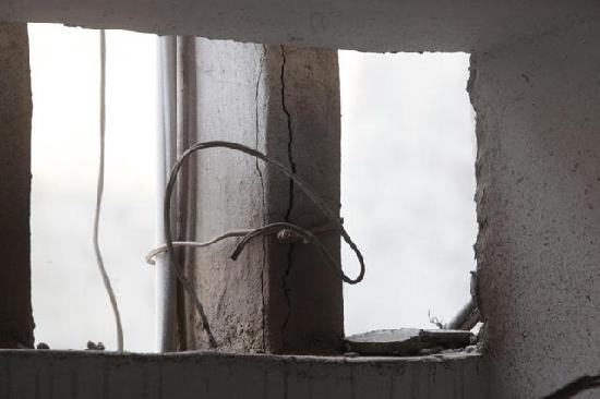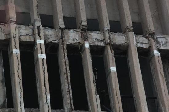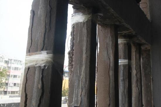 10月8日,山东济南历山东路2号一居民楼出现楼体柱子多处开裂,用透明胶带捆绑固定的情况。现场四单元顶楼位置两根悬在半空的柱子由两根绳子拽住,一些居民反映,外出家门十分担忧,有时抱头出行。