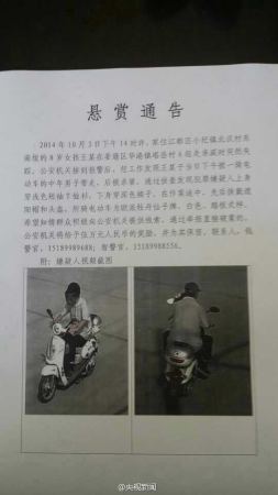 8岁的王彦雯10月3日到江苏姜堰华港镇亲戚家喝喜酒,被“骑电动车的人”带走。10月6日晚,小彦雯的尸体在河边被发现。警方悬赏5万缉凶:中年男子,穿浅色短袖T恤、深色裤子,途中换戴遮阳帽和头盔,白色电动车为欧派牡丹仙子牌。