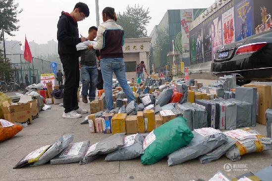 2014年10月09日,北京,中央民族大学门前,地上大大小小数百个包裹,众多快递公司“现场办公”,收发快递。阿Q/CFP