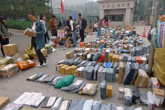 地上大大小小数百个包裹,众多快递公司“现场办公”。阿Q/CFP