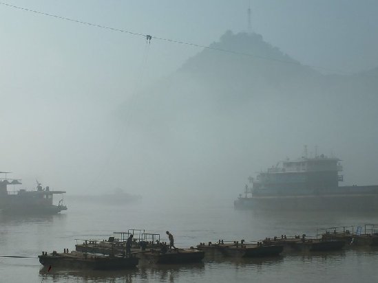 2014年10月2日清晨,湖北宜昌,长江江面大雾弥漫,宛如水墨画。