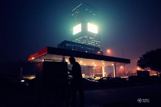 2014年10月10日晚,北京四环路,雾霾中的高楼。杨磊 摄