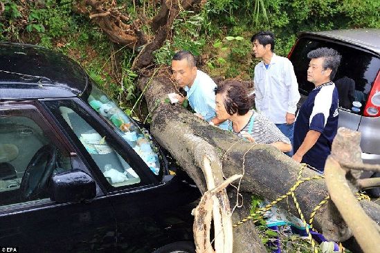 大树被掀倒,砸在车上,民众在试图将大树推开。