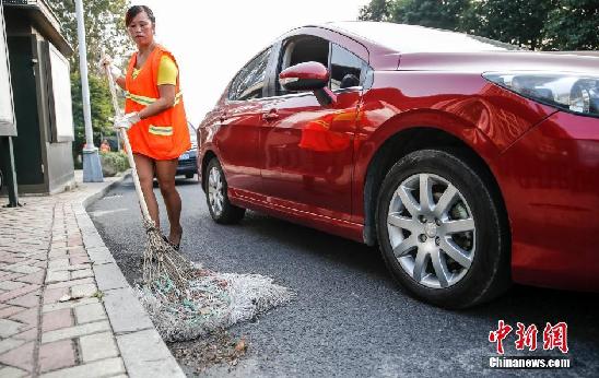 47岁的康明秀在自己的车旁边清扫责任路段。