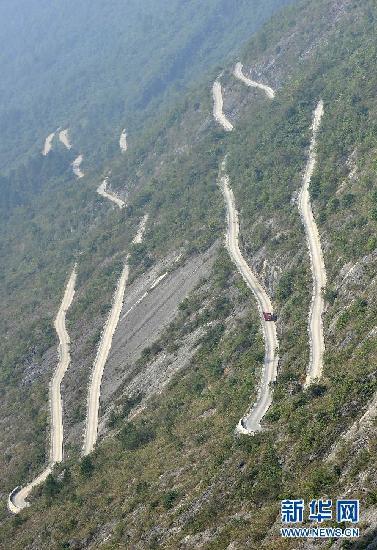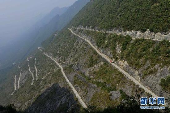 10月12日,一辆汽车行驶在湖北省恩施市新塘乡双木公路扯根坡段。位于湖北省恩施土家族苗族自治州恩施市新塘乡的双木公路(双河至木栗园),是一条全长约20公里的乡村公路,该公路经过名为扯根坡的大悬崖,长约4.4公里,非常险峻,犹如挂在悬崖上,被称为“壁挂”公路。新华社发(杨顺丕摄)