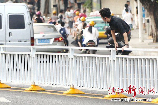 世贸前的栏杆高度将要到胸口了,这名年轻人偏偏要向“高难度”挑战。