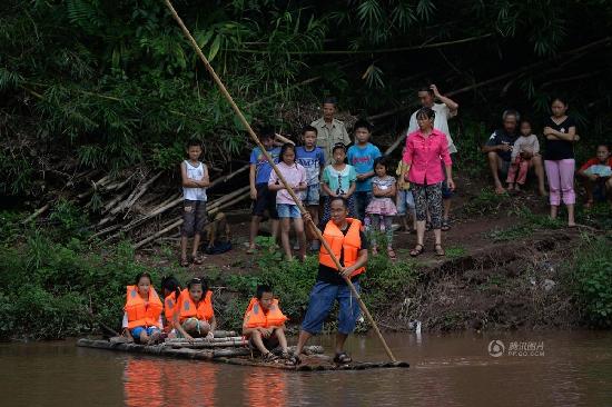 在四川宜宾的群山峻岭之中,星山村距离高县县城的直线距离并不算远。但因重重大山和村边二夹河的阻隔,星山村至今仍是一个偏僻落后的小山村。二夹河上几十个“跳蹬子”(石头墩子)通往外面的世界,是村民外出的主要途径,也是星山村几十个娃娃到几里地外红旗小学上学的必经之路。湍急的二夹河中,通过“跳蹬子”过河并不安全,娃娃们每天上学和放学,都有家长和村民护送过河。在二夹河边,大家最熟悉的人莫过于58岁的罗光林老人。图为9月15日,星山村的罗光林老人用竹竿撑着竹排接星山村的小学生们过河回家。吴江 摄