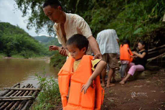 罗光林义务接送村里的娃娃过河上学放学,只要他人在村里,这就成了他的“工作”,风雨无阻。老人也不能准确记得,自己是从什么时候开始干上这个没有工资的“工作”。记性好的村民帮他算了算,到2014年,已经有27个年头了。图为星山村的村民把小学生送上罗光林的竹排。吴江 摄