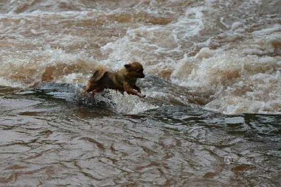 河水湍急,一条小狗跨过二夹河上的“跳蹬子”。吴江 摄