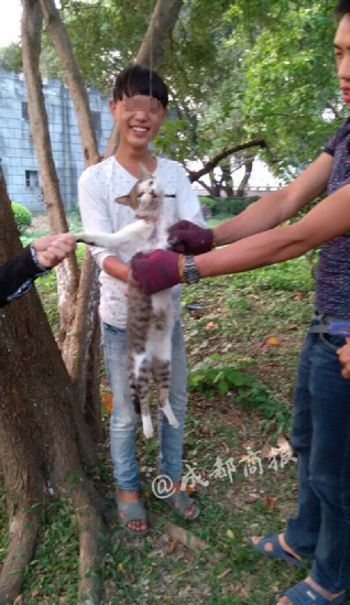 15日,浙江温州江心屿景区内,四五名男女将一只猫咪悬吊树上,一女子手握美工刀,竞以活剥猫皮为乐,可怜的猫咪发出阵阵撕心裂肺的凄厉叫声,令人胆战心惊。一参与活剥猫皮的男子说:“是我们捕获的野猫,肉好吃的很”。