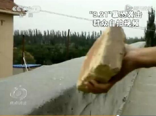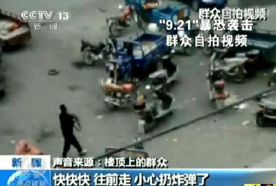 一段由群众拍摄的9.21暴恐袭击视频,记录了警方在阳霞镇市场街道上围剿暴恐分子的行动。此时,人们已被疏散到安全地带,街道上只有民警和躲在角落里、手持爆炸装置负隅顽抗的暴徒,而几位据守市场边楼顶上的群众,成为警方地面打击行动中的空中瞭望哨。楼顶上的群众还将砖头砸向地面上的暴恐分子,迫使其难以藏身。虽然情况复杂,群众和民警一同配合,圆满完成了打击恐怖分子的任务。