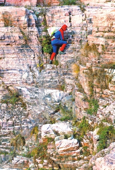 10月18日下午,穿着红蓝相间的“蜘蛛侠”服装,45岁的新乡南太行九莲山环卫工人刘建成,挂在160多米高的太行山绝壁上,晃来荡去地捡着垃圾。
