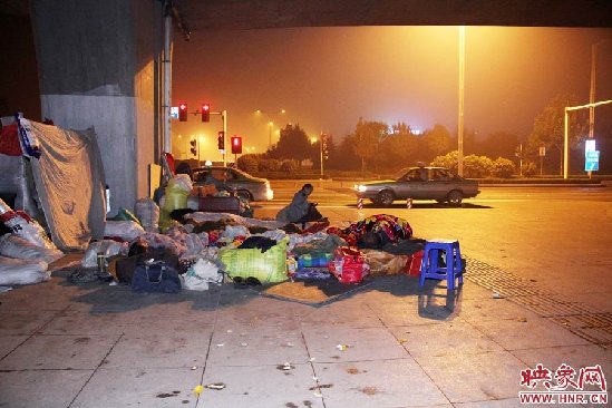 郑州民工雨夜露宿高架桥下 地上仅铺一张凉席