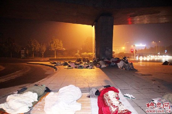 郑州民工雨夜露宿高架桥下 地上仅铺一张凉席