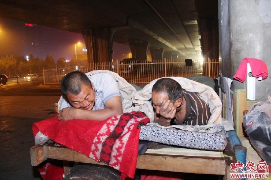 郑州民工雨夜露宿高架桥下 地上仅铺一张凉席