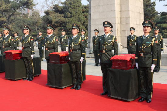 装有烈士遗骸的棺椁覆盖着国旗,持枪礼兵守护在四周,现场庄严肃穆。