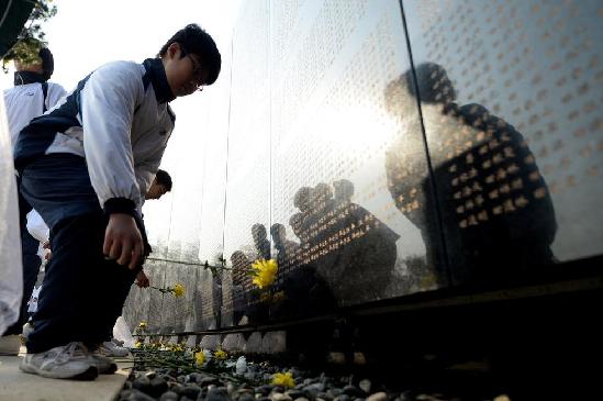 10月29日,辽宁省沈阳市, 学生为烈士英名墙献花。沐影/CFP