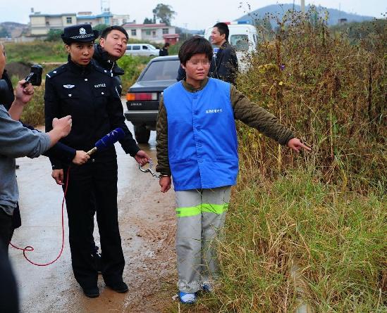 2014年10月29日,云南昆明,涉嫌杀人抛尸的14岁少女王小妹和她25岁的男友段郎在派出所警察押送下指认杀人抛尸现场。10月12日,两人共谋抢劫黑车司机,因64岁黑车司机反抗痛下杀手。图为指认现场照片。