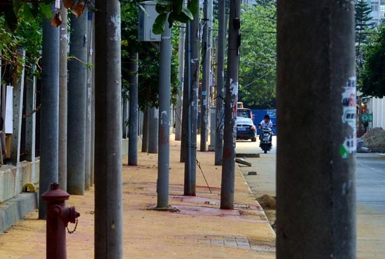 10月30日上午,南国早报记者在大庆路上看到,约300米的人行道上密密麻麻竖立着几十根线杆。记者沿着人行道逐一点数,发现线杆数目有70根,不少地方甚至有四五根线杆一起“抱团”,过往行人只能在缝隙中穿行。记者注意到,人行道上的便道砖刚铺上不久,上面还散落着一些沙土。一名在现场的施工人员说,之前修整人行道时,有相关单位过来新架设了一批线杆,但具体是哪些单位,他也不知道。