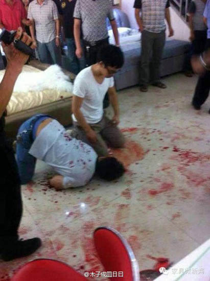 冯女士一边向记者展示她拍到的照片,一边向记者解释:“穿白衣服的是砍人者,旁边的是他的同伴,被老板娘弟弟打晕在地上。”冯女士表示听旁边人说,他们之前在店里和老板娘吵架还打了起来,后来老板娘叫来她弟弟,手里还拿把菜刀,这个白衣服的买家就从裤管里抽出来一把匕首砍人了,砍了老板娘弟弟好多刀。