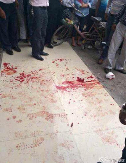而据乐从警方昨日傍晚通报,昨日13时20分,2名男子贺某某和贺某(均系湖南人)在乐从国际家私城一店内与店主杨某(女,四川人)发生买卖纠纷,杨某随即喊来其父亲和弟弟等人,继而双方发生打斗。杨某的弟弟被刺中腹部,经送医院抢救无效死亡。此外,杨某父亲和其中一名嫌疑人受伤(均为轻微伤)。图为现场血迹。
