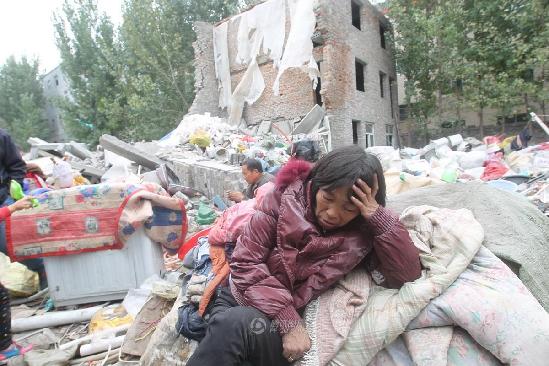 2014年11月1日凌晨2点左右,河南郑州市高新区石佛镇陈庄村,张红军一家共9人正在房子里睡觉,突然,外面有人开始拆房子。在邻居的大声呼叫下,他们惊慌地跑出房子。看着废墟一片,张红军和家人十分惊恐:如果跑不出来,命都没了。图为1日上午9点,记者在现场看到,一个大院子内三栋楼房各被拆了大半,院子里一片废墟。张红军的妻子躺在废墟里的棉被上。