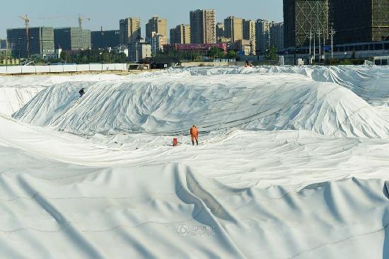 工人在“泄气”后的“毒气帐篷”上进行检查。目前,在该地块方圆一公里内,仍然可以闻到农药厂土地上散发的浓重异味。龙巍/CFP