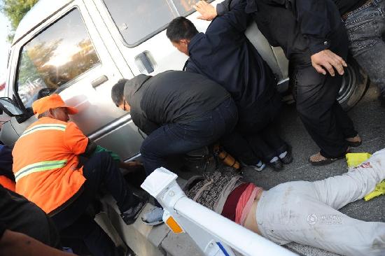 山东老妇车祸遭碾压 十余市民合力抬车救人