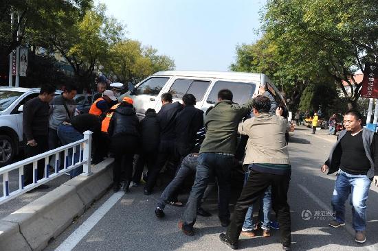 山东老妇车祸遭碾压 十余市民合力抬车救人