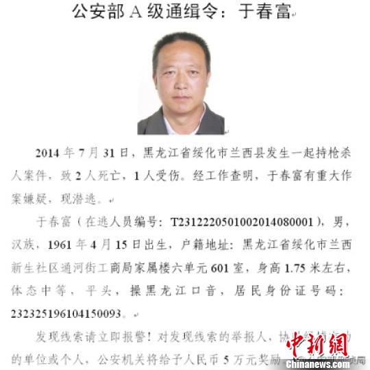 7月31日中午,黑龙江省绥化市兰西县新工商小区和该县北安乡隆盛河村河套内接连发生两起枪击案,造成2人死亡1人受伤,犯罪嫌疑人于春富案后潜逃。