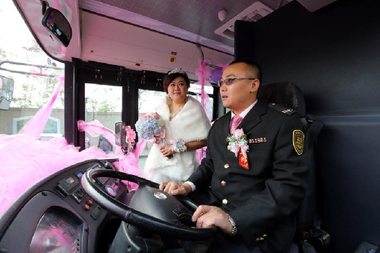 他们从相识、相知、相恋到今天成为一对夫妻,都与温馨巴士分不开。为此,他们以大公交车为婚车,使婚礼更有特色、更有意义。由于这辆“巨无霸”公交车实在太抢眼,行人无不关注。