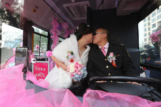 新郎陆甲和新娘李宁在公交车上甜蜜亲吻。