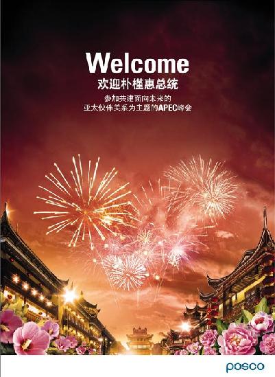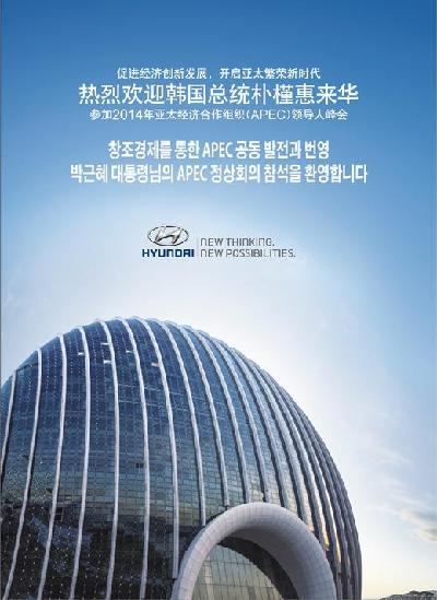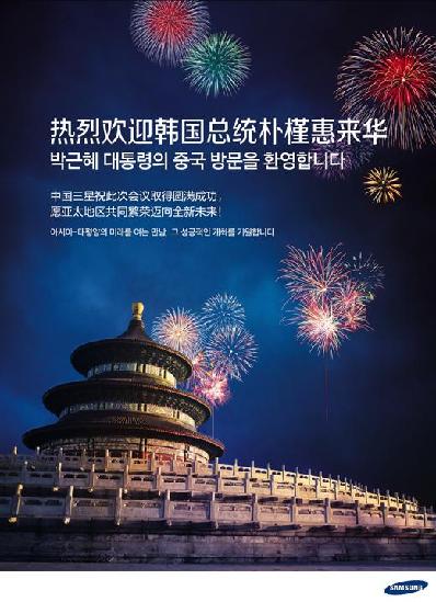 2014年11月10日,四家在华韩国企业在人民日报刊登四个整版广告,欢迎朴槿惠总统来华参加APEC领导人非正式会议。