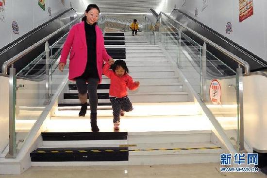 【郑州地铁现“钢琴”台阶】近日,郑州地铁1号线郑东新区会展中心站新开通与丹尼斯商场相连的C出站口通道,一段26级的台阶被装饰成钢琴黑白琴键造型,行人通过时会发出不同的声音,如同一部巨大的钢琴在演奏。(丁友明摄)