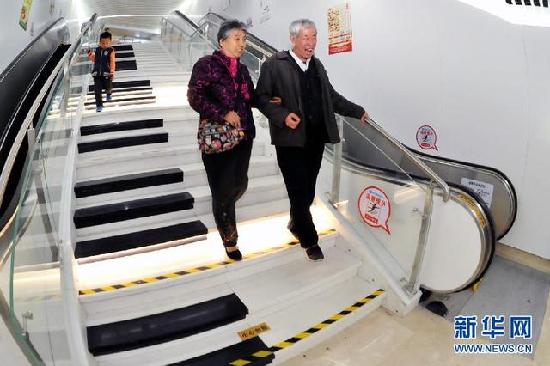 11月10日,在河南郑州地铁1号线会展中心站,行人在“钢琴台阶”上行走。近日,郑州地铁1号线郑东新区会展中心站新开通与丹尼斯商场相连的C出站口通道,一段26级的台阶被装饰成钢琴黑白琴键造型,行人通过时会发出不同的声音,如同一部巨大的钢琴在演奏。据地铁员工介绍,每个大理石台阶下方均调试设定好音阶,台阶左右的圆孔内装有光控感应装置,能够识别行人经过。踏上台阶时,楼梯顶端的音箱会播放钢琴声,台阶下的灯光也会短暂亮起。新华社发(丁友明摄)