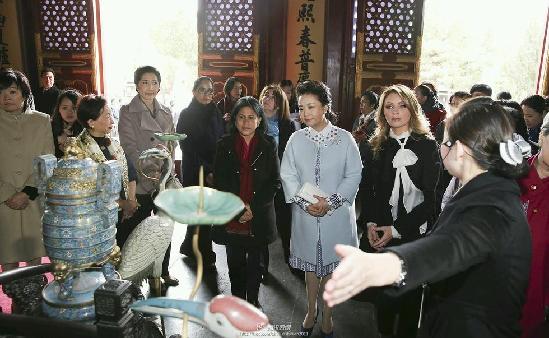 彭丽媛同夫人们参观了仁寿殿、知春亭、德和园、长廊、排云殿等,乘船游览了昆明湖。